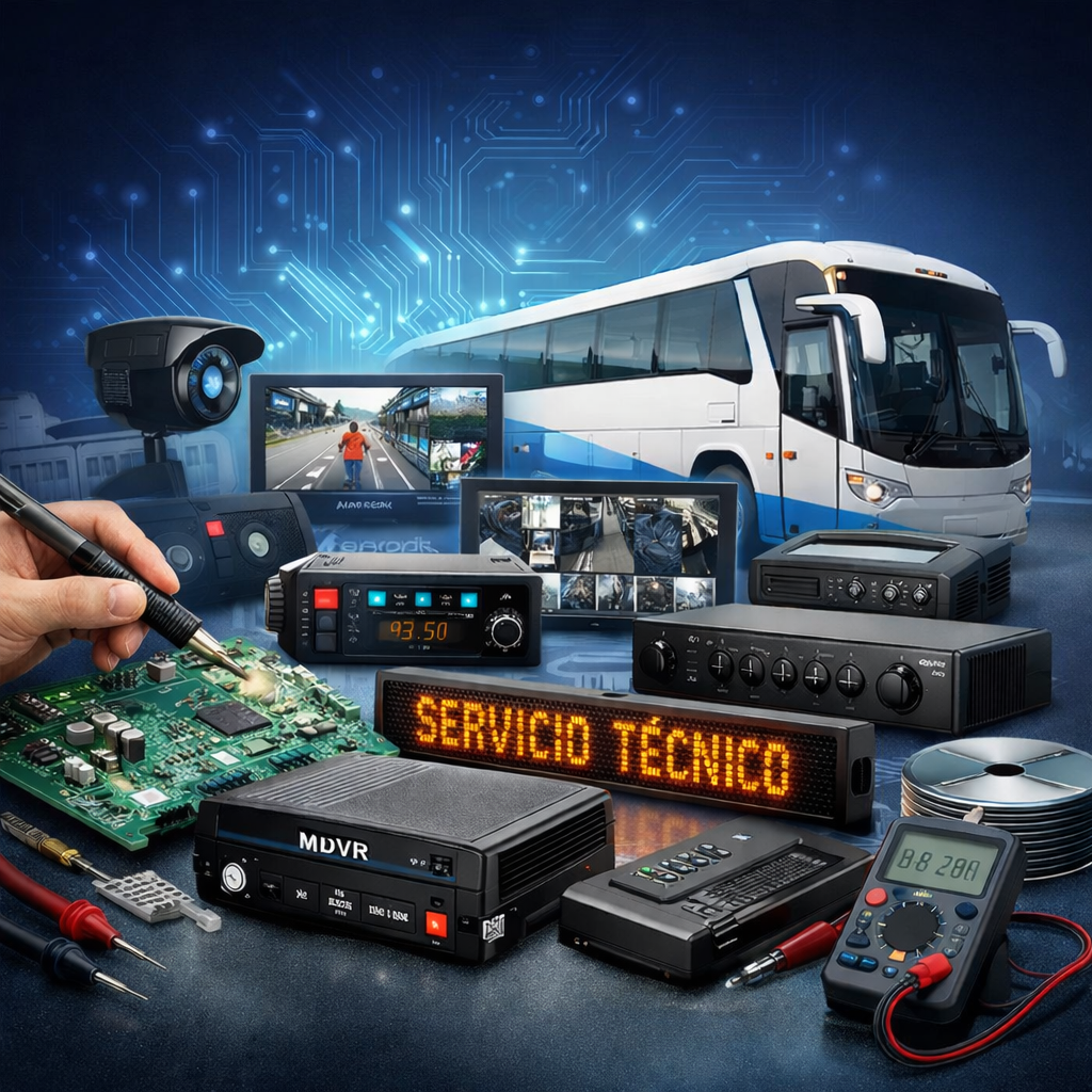 Reparamos pantallas, monitores, amplificadores de audio, radios, DVD y otros equipos electrónicos instalados en buses, asegurando su correcto funcionamiento y prolongando la vida útil de cada componente.